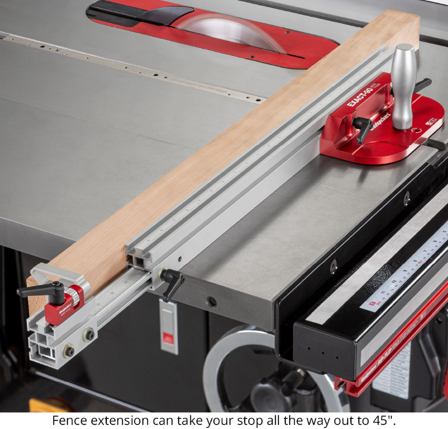 Perfectly square is great, but accurately controlling the length of your stock is critical, too. The Exact-90 includes a newly designed fence with an easy-to-read scale right on top. The fence houses an extension that slides out to take the flip stop all the way to 45 inches. Speaking of the flip stop, its new design lets you dial in the position of the flag with finger-tip control...no tapping or nudging. And, none of the adjustments on the fence, flip stop or extension...no searching for lost Allen wrenches. Also, there's a sacrificial fence which can be used to reduce tear-out and fully support your material all the way through the blade.