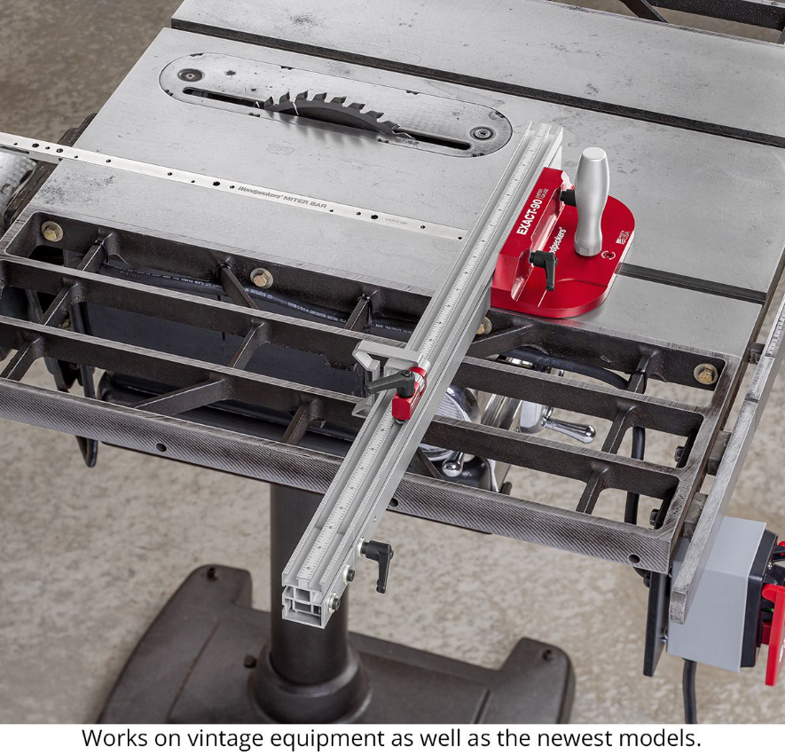 If your saw has a T-track miter slot, the Woodpeckers Miter Bar has two T-washers, not just one, giving you extra support when making wide cross-cuts. No T-track? No problem. The T-washers come off with simple counter-sunk screws. Bottom line? If your miter slot is anywhere close to 3/8" x 3/4" the Exact-90 will fit. The leaf spring feature easily accomodates miter slots from .742" to .765" wide.